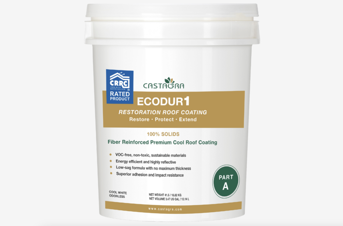 Castagra Products introduced Ecodur1 Cool Roof Coating. The product offers an eco-friendly, highly durable, and energy-efficient solution for commercial roofs. Ecodur1 is a fiber-reinforced premium cool roof coating that is energy efficient and highly reflective, meeting the requirements of California Energy Commission (CEC) Title 24; it is listed by the CRRC. Made from renewable castor oil and gypsum, Ecodur1 is VOC-free and non-toxic, making it safe for both installers and the environment. castagra.com